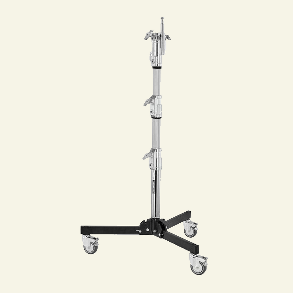 Pied avec spigot 16 et 28 compact, sur roulette et pliable. Une extension est disponible pour élever la hauteur maximum.